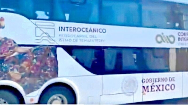 En videos se aprecia que los camiones, rotulados con el logotipo del Tren Interoceánico, circulan por las calles de Oaxaca con varios pasajeros a bordo.