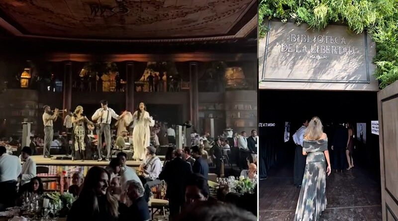 La ambientación llevaba por título “Biblioteca libertad”: un pasillo con imágenes de figuras históricas como Margaret Thatcher y frases como “Socialism is only about distribution”, además de billetes con la cara de Salinas Pliego con realidad aumentada y una gigantesca moneda de tipo bitcoin. Incluso el pastel simulaba una pila de libros.