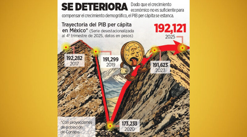Con un crecimiento económico de sólo 0.8 por ciento en 2025, el PIB per cápita registró una ligera contracción respecto al año previo y se habría ubicado en 192 mil 121 pesos, de acuerdo con cálculos de la organización «México, ¿cómo vamos?».