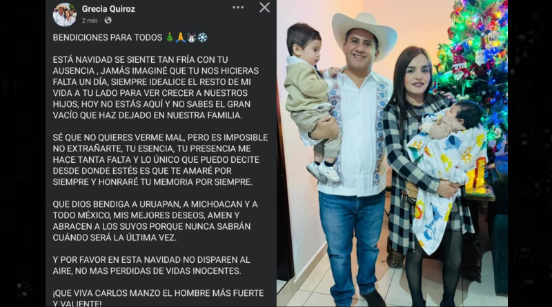 Ciudad de México 24 diciembre 2025.- La Alcaldesa independiente de Uruapan, Michoacán, Grecia Quiroz, recordó a su esposo, el fallecido Carlos Manzo, al emitir un mensaje de Navidad en redes sociales.
